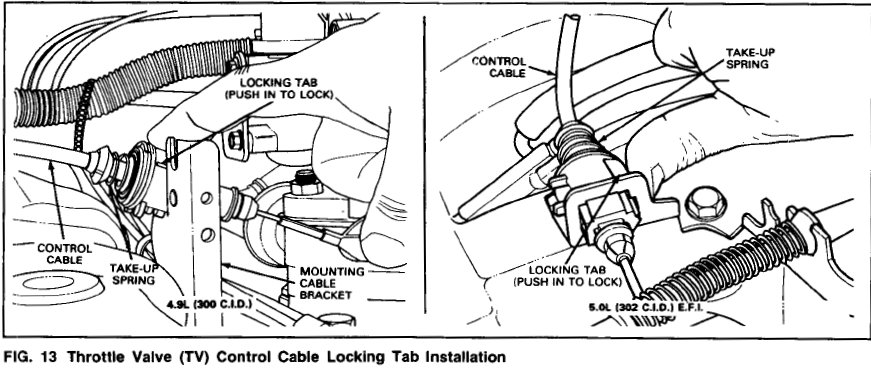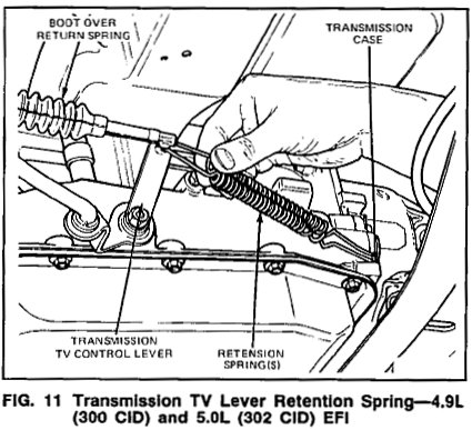 16. Connect the TV cable to the transmission TV lever. Connect the manual linkage rod to the manual lever at the transmission.