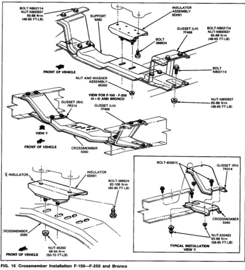12. Position the crossmember on the side supports. Position the rear mount on the crossmember and install the attaching bolt and nut.