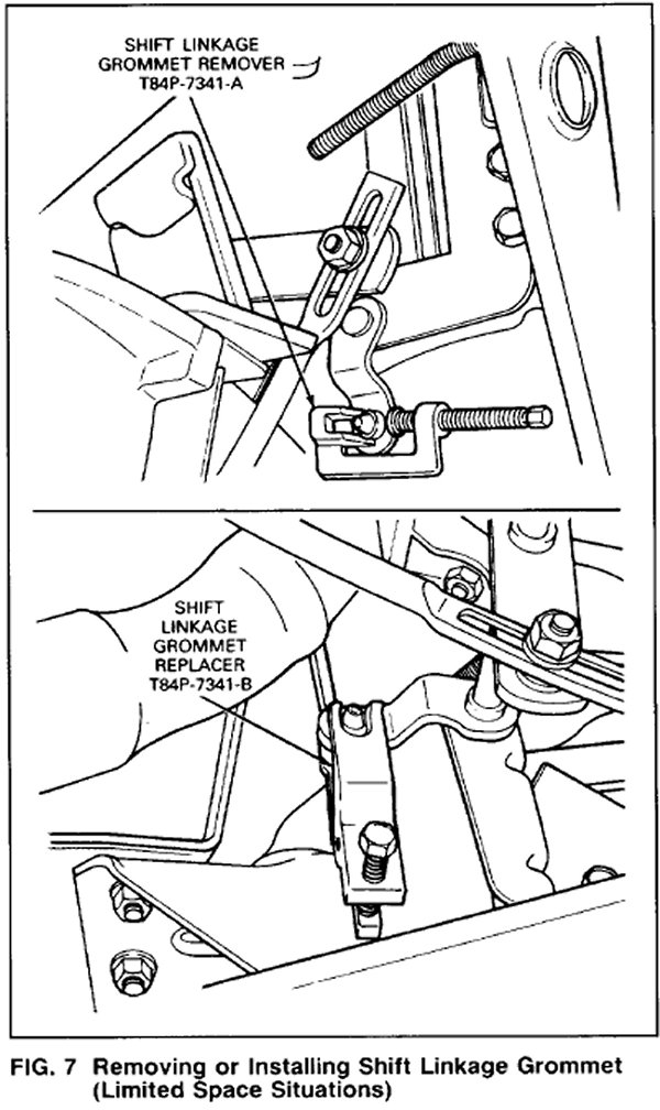 1. Place the lower jaw of the Shift Linkage Installation Tool, T67P-7341-A between the lever and the rod Fig 6). For areas with limited space, use Shift Linkage Grommet Remover, T84P-7341-A for removal of the grommet (Fig. 7). Position the stop pin against the end of the control rod (Fig. 6) and force the rod out of the grommet. Remove the grommet from the lever by cutting off the large shoulder with a sharp knife. The grommet must be removed from the lever and a new one installed each time the rod is disconnected.