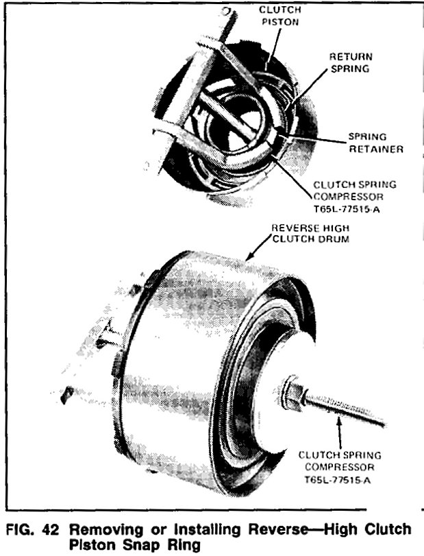 3. Install Clutch Spring Compressor, Tool T65L-77515-A (Fig. 42) on the reverse-high clutch drum. Make sure that the legs clear the snap ring enough to remove it. Remove both snap rings and remove the tool.