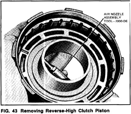 5. Apply air pressure to the piston apply hole in the clutch hub using TOOL7OOO-DE (Fig. 43) and remove the piston.