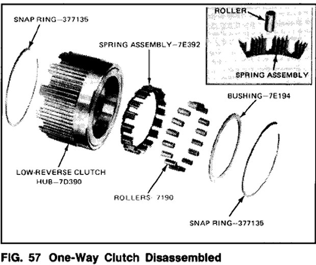 1. Remove the snap ring and bushing from the rear of the low-reverse clutch hub (Fig. 57).