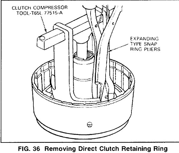 4. Using Clutch Spring Compressor Tool T65L-77515-A (or equivalent), compress the piston return springs and remove the retaining ring (Fig. 36).