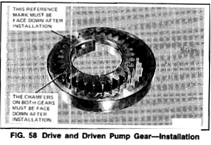 1. Install the drive and driven pump gears in the pump body as shown in Fig. 58. Chamfers on both gears face into the pump body.