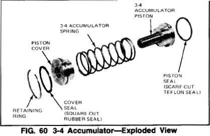 NOTE: Some transmissions will be built without a spring. Also~ the piston and spring construction may be different from that shown. Be sure the diagonal cuts on the piston seal are aligned properly.