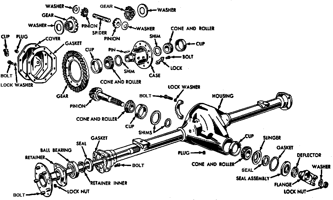 This rear axle, Fig. 1, is a semi-floating type, while the axle shown in Fig. 2 is of the full-floating type. The drive pinion of either axle is of the over-hung design, mounted on preloaded tapered roller bearings. Sealing of the pinion shaft is accomplished by a spring-loaded seal on the companion flange. The flange is splined and secured to the pinion shaft by a nut.