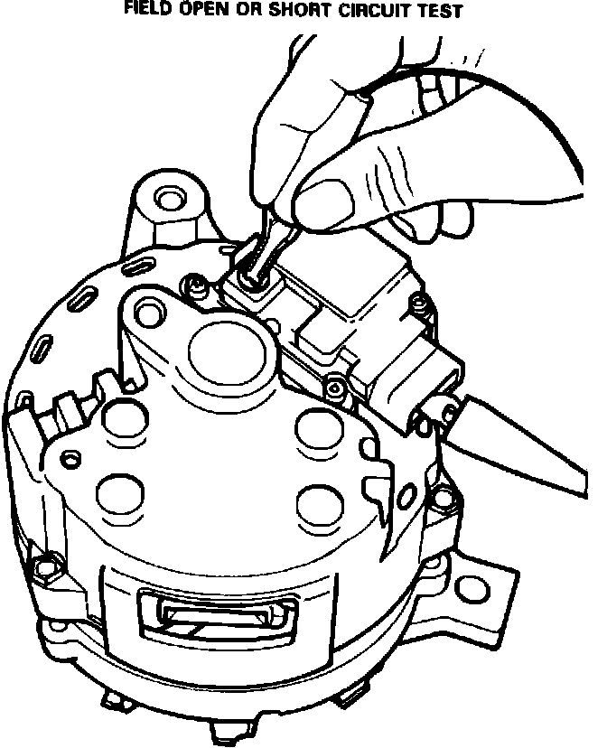 6. Connect alternator rear housing with one ohmmeter probe and touch the other probe to the regulator ``F'' terminal. Reverse probes and repeat test. Ohmmeter reading should be infinite in one probe direction and approximately 9 ohms in the other.