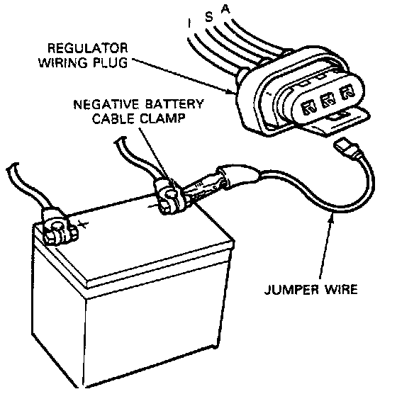 4. If indicator lamp does light, remove jumper wire and reconnect wiring plug to regulator. Connect voltmeter negative lead to battery negative post cable clamp and contact voltmeter positive lead to regulator A terminal screw. Battery voltage should be indicated. If battery voltage is not indicated, service A circuit wiring.