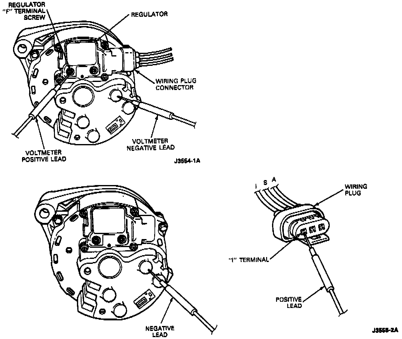 3. If no voltage was indicated in Step 2, contact the voltmeter positive lead to the wiring plug S terminal. No voltage should be indicated. If no voltage is indicated, replace the regulator.