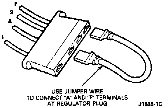 3. If the voltmeter still indicates a problem of under voltage, remove the jumper wire from the regulator plug and leave the plug disconnected from the regulator. Disconnect the FLD terminal on the alternator and pull back the protective cover from the BAT terminal. Then connect a jumper wire to the FLD and BAT terminals on the alternator and repeat the load test. Load Test