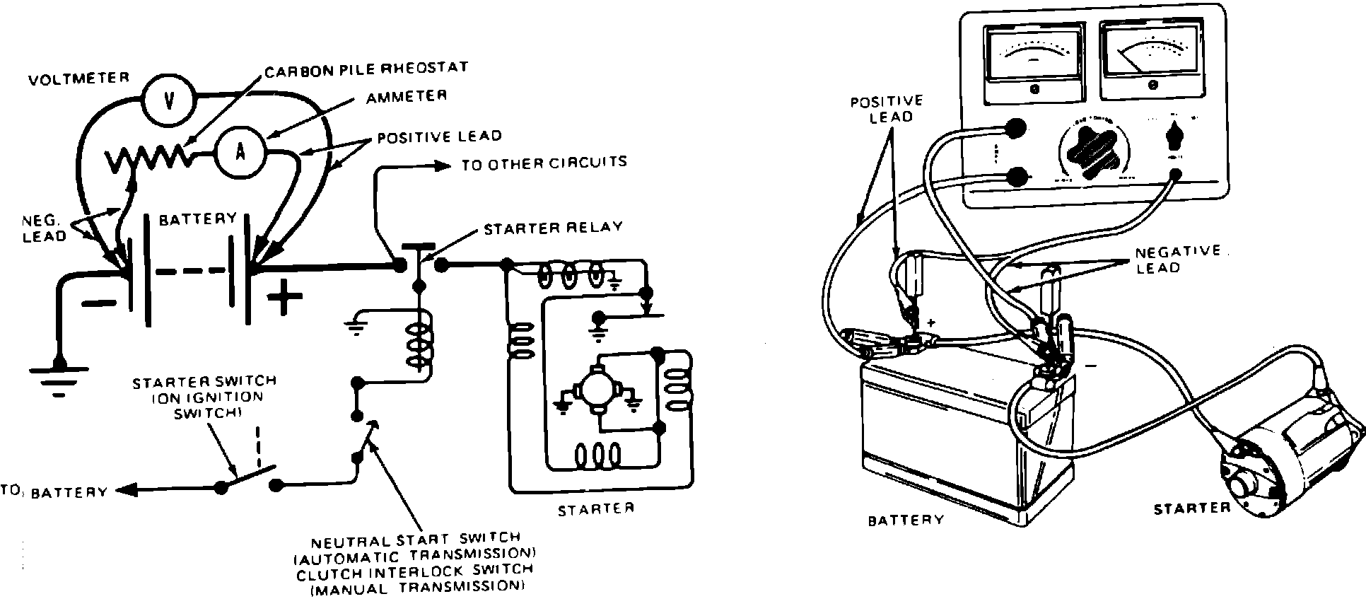 5. Stop cranking engine, then reduce resistance of carbon pile until voltmeter indicates same reading as obtained while engine was cranked. Ammeter should read 150---200 amps on 4 inch diameter starter, or 150---180 amps on 4{1/2} inch diameter starter.