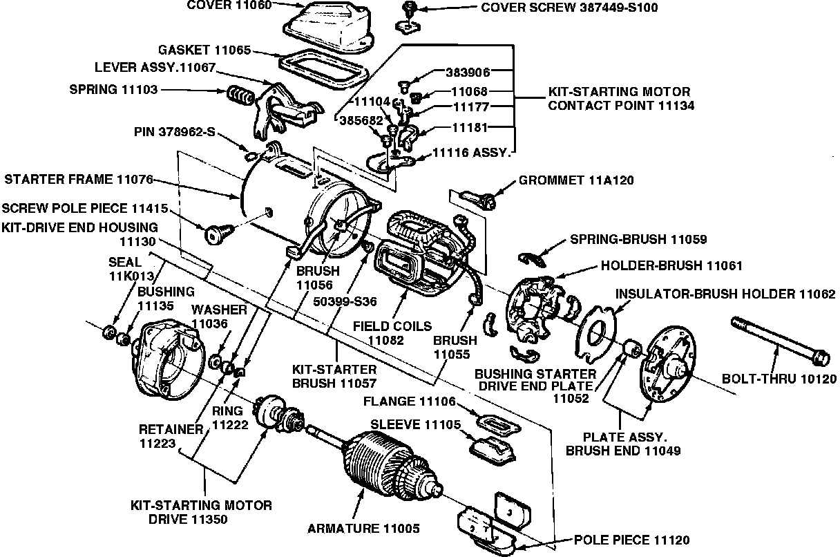 When the ignition switch is turned on to the start position, the starter relay is energized and supplies current to the motor. The current flows through one field coil and a set of contact points to ground. The magnetic field given off by the field coil pulls the movable pole, which is part of the lever, downward to its seat. When the pole is pulled down, the lever moves the drive assembly into the engine flywheel, Fig. 2.