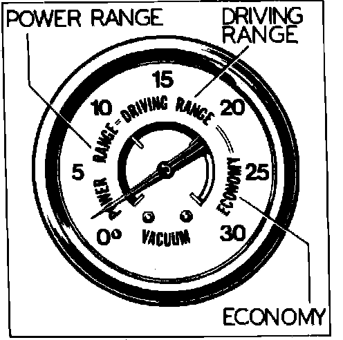 Since the optimum fuel economy is directly proportional to a properly functioning engine, a high vacuum reading on the gauge relates to fuel economy. Most gauges have colored sectors the green sector being the ``Economy'' range and the red the ``Power'' range. Therefore, the vehicle should be operated with gauge registering in the green sector or a high numerical number, Fig. 2, for maximum economy.