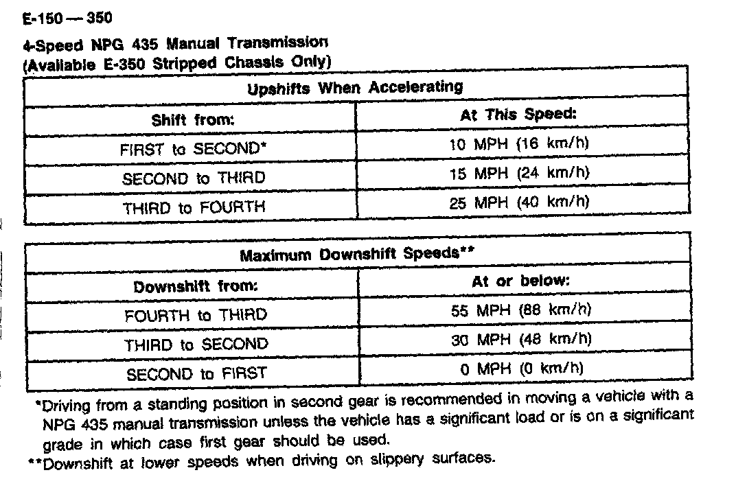 New Process 435 4-spd M/T, Upshifts/Downshifts-MPH (E-150-350):