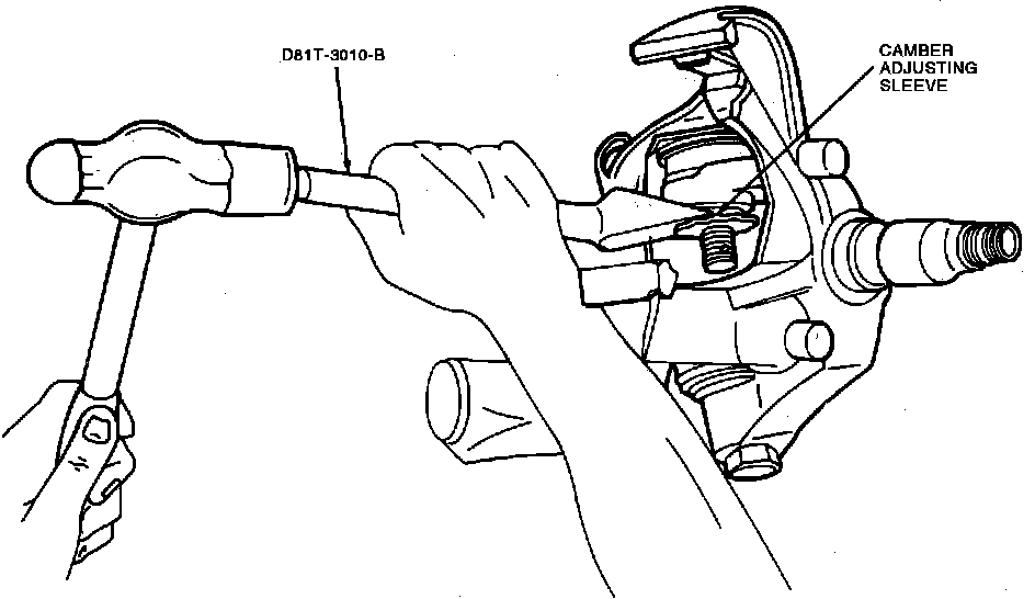 The camber angle may be adjusted by means of mounting sleeves placed on the upper ball joint, Figs. 9, 10 and 11. Four sleeves are available in {1/2}° camber increments to allow a 3° range of adjustment from - 1 {1/2}° to +1 {1/2}°.