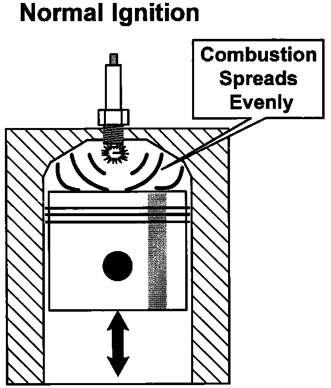 With normal ignition and combustion, the ignition spark ignites the fuel mixture and the combustion spreads evenly across the cylinder. When spark knock occurs, excessive heat and pressure or heated carbon particles ignite the fuel mixture concurrently with the ignition spark, resulting in two separate combustions within the cylinder. The two flame fronts collide, resulting in spark knock or pinging.