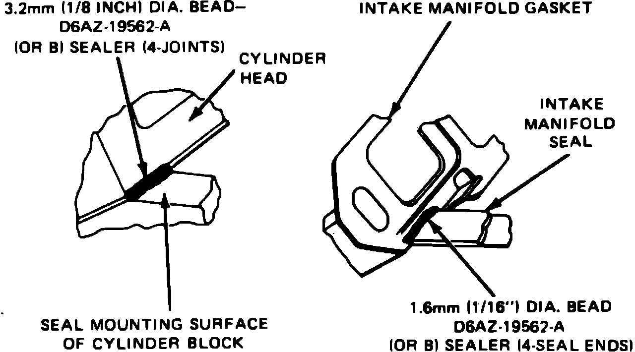 a. Before installing lower intake manifold, apply {1/8} inch bead of silicone rubber sealer DAZ-19562-A or equivalent at mating surfaces of intake manifold, cylinder heads and cylinder block, Fig. 18. Also apply a {1/16} inch bead of sealer to the outer end of intake manifold seal for the full width of the seal.