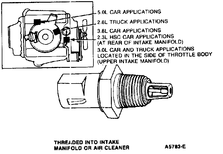 The sensor is rigidly threaded into a cylinder runner of the intake manifold or attached to the air cleaner and provides the fuel strategy with mixture temperature information. The sensor input is used as a density corrector for air flow calculations and to proportion the cold enrichment fuel flow.