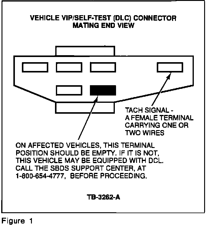 The VIP/Self-test (DLC) connector on these vehicles contains a tach wire that generates a voltage spike that damages the MCVI circuit board in the SBDS. The damage will become evident when SBDS tools that utilize the Data Communications Link (DCL) are used later, on a vehicle equipped with DCL. Refer to the following detailed service procedure for information.