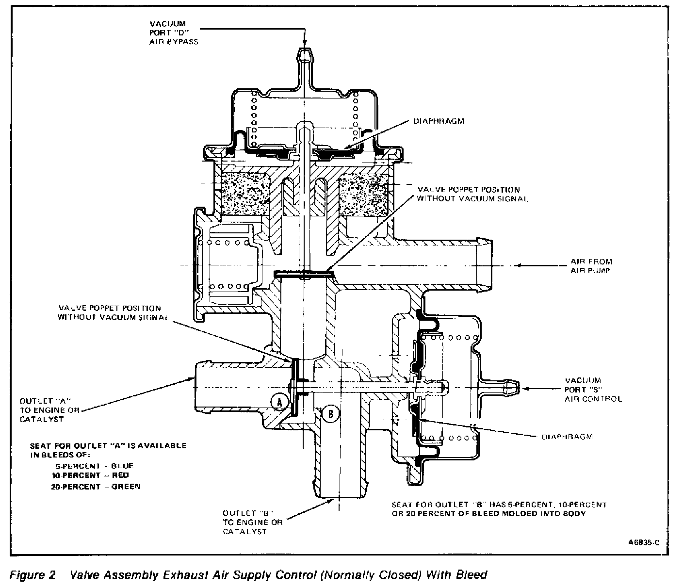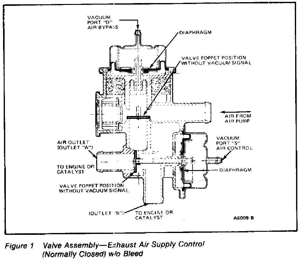 6. Apply 27-34 kPa (8.10 in-Hg) vacuum to port S With engine operating at 1500 rpm, air flow should be noted coming out of outlet A.