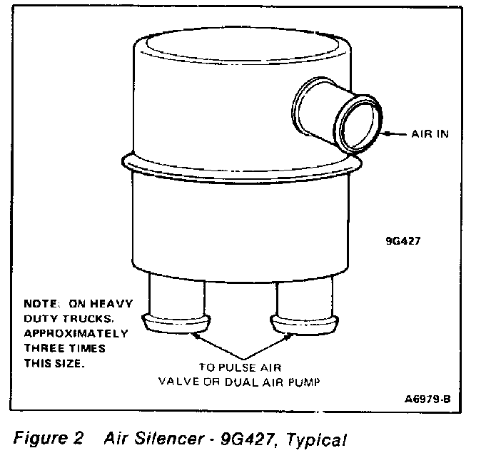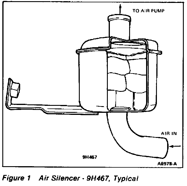 The Air Silencer is a combination silencer and filter for air supply pumps that are not equipped with an impeller type centrifugal air filter fan or for pulse air (thermactor II) Systems. The air silencer is mounted in a convenient position in the engine compartment and is connected to the air supply pump or pulse air valve inlet by means of a flexible hose.