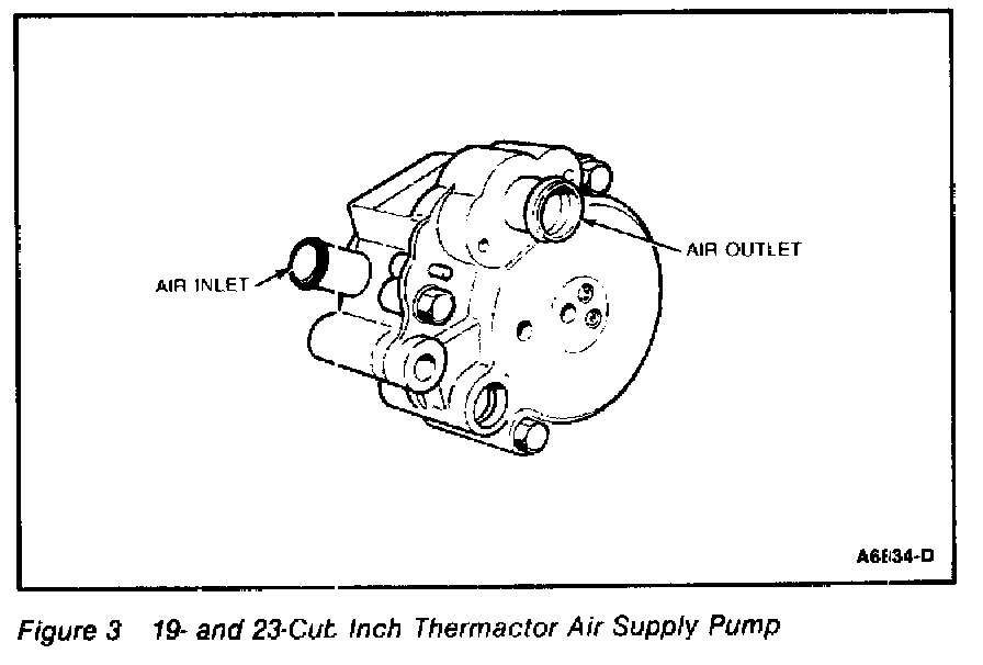 The Air Supply Pump is a belt driven, positive displacement, vane type pump that provides air for the thermactor system It is available in 19-cubic inch and 23-cubic inch sizes, either of which may be driven with different pulley ratios for different applications. Both pumps (Figure 3), receive air from a remote silencer filter attached to the pumps' air inlet nipple. The pressure relief function is performed by the bypass valve.