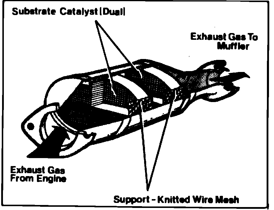 There are basically three types of catalysts, the conventional oxidation catalyst (COC) containing Platinum (Pt) and Palladium (Pd) which are effective for catalyzing the oxidation reactions of hydrocarbons (HC) and carbon monoxide (CO) emissions. A three-way catalyst (TWC) containing Platinum (Pt) and Rhodium (RH), is not only effective for catalyzing the oxidation reactions of HC and CO emissions, but it also catalyzes the reduction of nitrogen oxides (NOx). A light off catalyst (LOC) is a single bed converter. It is arranged in series with the main catalytic converter assembly of COC and/or TWC as the aft member(s). This converter is designed to perform the very specialized function of exhaust emission control during engine warm-up when the main converter(s) is not yet at the temperature required for maximum efficiency. The LOC is designed to operate effectively in the high environmental conditions that exist near the manifold flange. The LOC is designed with a minimum heat sink effect and, provides minimum delay in warm-up of the main catalytic converter(s). The oxidation catalyst requires the use of a secondary air source which is provided by the pulse air or thermactor air injection systems.