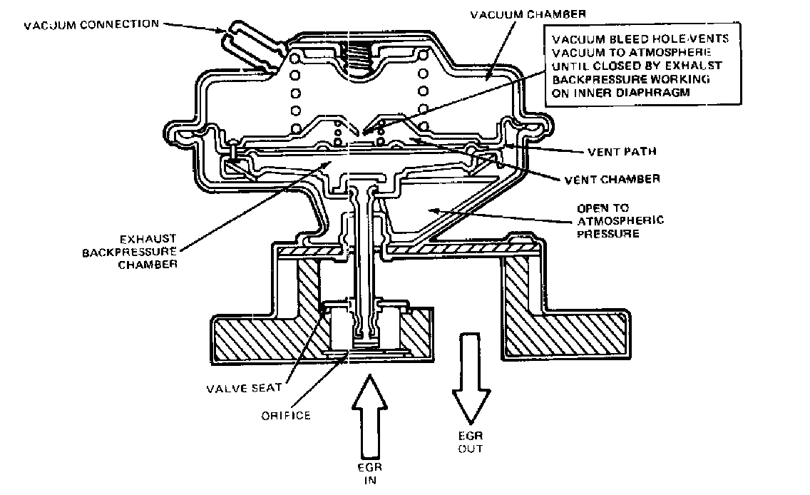 The Integral backpressure transducer EGR valve combines inputs of backpressure and EGR port vacuum into one unit. The valve requires BOTH inputs to operate. The valve will not operated on vacuum alone. The backpressure valve has two types; poppet and tapered pintle.