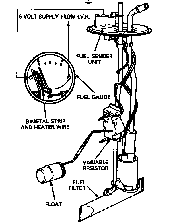 DESCRIPTION AND OPERATION FUEL LEVEL INDICATING SYSTEMThe fuel indicating system is a bimetal-resistance type system. It consists of an instrument voltage regulator, fuel indicator (gauge) mounted in the instrument cluster and a sender located in the fuel tank,