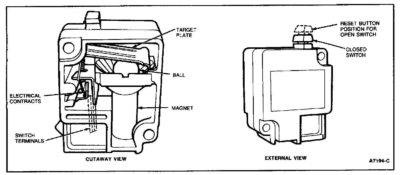 The inertia Switch, is used in conjunction with an electric fuel pump. The purpose of the inertia switch is to shut off the fuel pump in the event of an accident. It consists of a steel ball held in place by a magnet. When a sharp impact occurs, the ball breaks loose from the magnet, rolls up a conical ramp and strikes a target plate which opens the electrical contacts of the switch and thereby shuts off the electric fuel pump. Once the switch is open, it must be manually reset before re-starting the vehicle. The location of the switch is discussed in the owners guide.