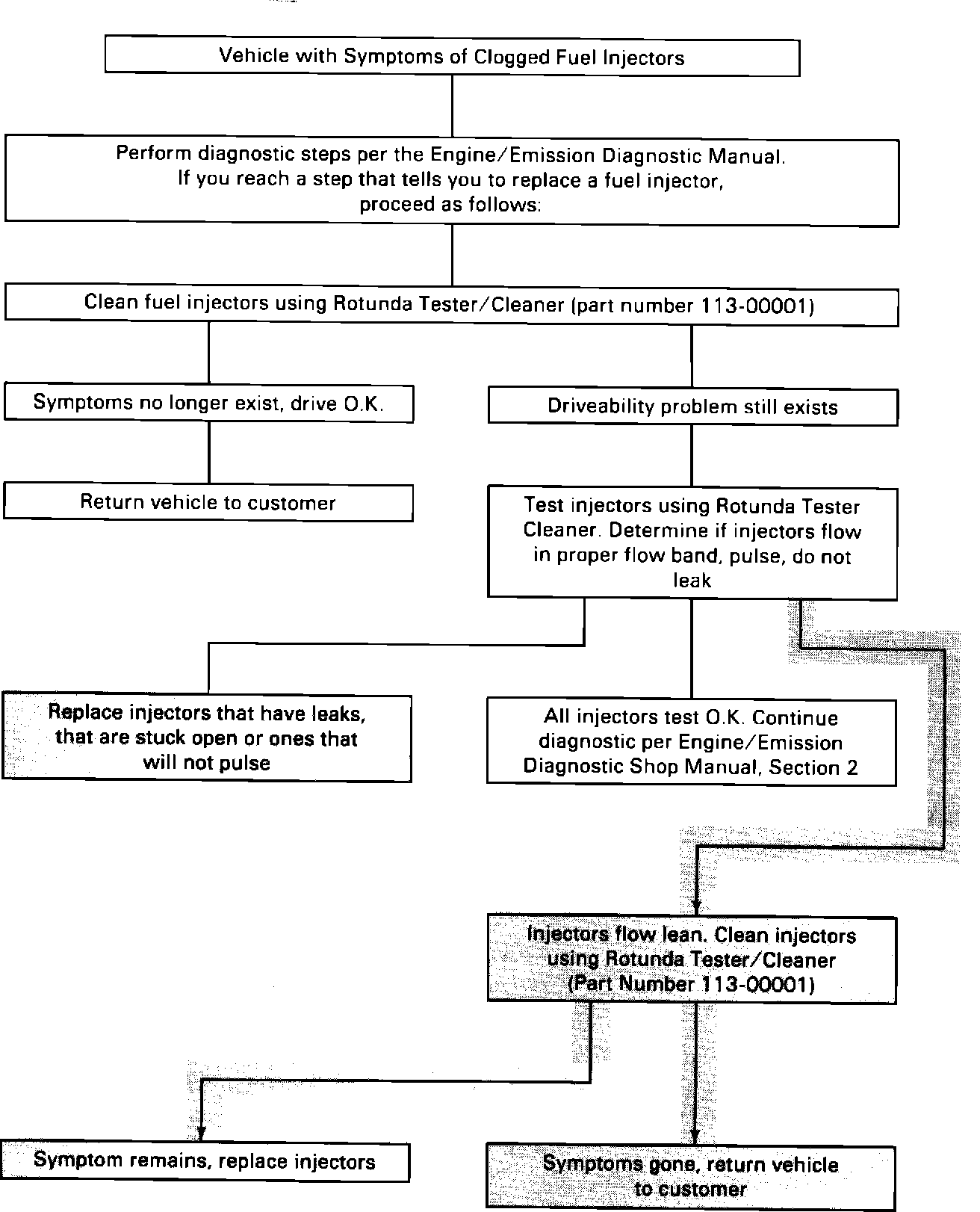 ACTION: To correct this, follow normal diagnostics as shown in the Engine/Emissions Diagnosis Manual, Section 2. If you get to a step that instructs you to replace a fuel injector, FIRST try cleaning the injector with the Rotunda Tester/Cleaner, 113-00001. If the condition still exists after cleaning, the injectors should be flow tested to make sure they are functioning properly. If the flow test indicates lean injectors, a second cleaning may be necessary because of severe injector fouling. Refer to the diagnostic chart on page 69 of this TSB for step-by-step instructions.