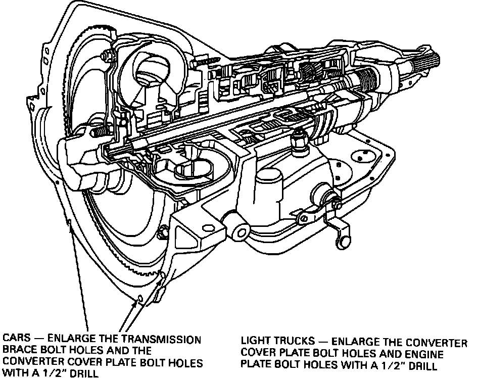 ACTION: If a transmission case replacement is required on a past model vehicle, the bolt holes for the car's transmission brace and converter cover plate will need to be enlarged with a 1/2" drill. On light trucks, enlarge the converter cover plate and engine cover plate with a 1/2" drill. Refer to Figure 1 for the bolt hole locations.
