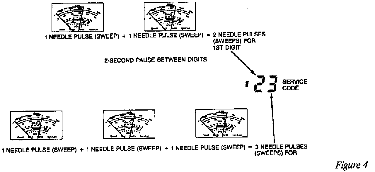 Count the needle sweeps and write down the codes in order. Watch for separator code 11 and code 10. These are not faults but indicate "no codes" and divisions between processor memory. Figure 5 is an example of "No Codes". If there were codes present, they would be displayed in the 4 second pause location.