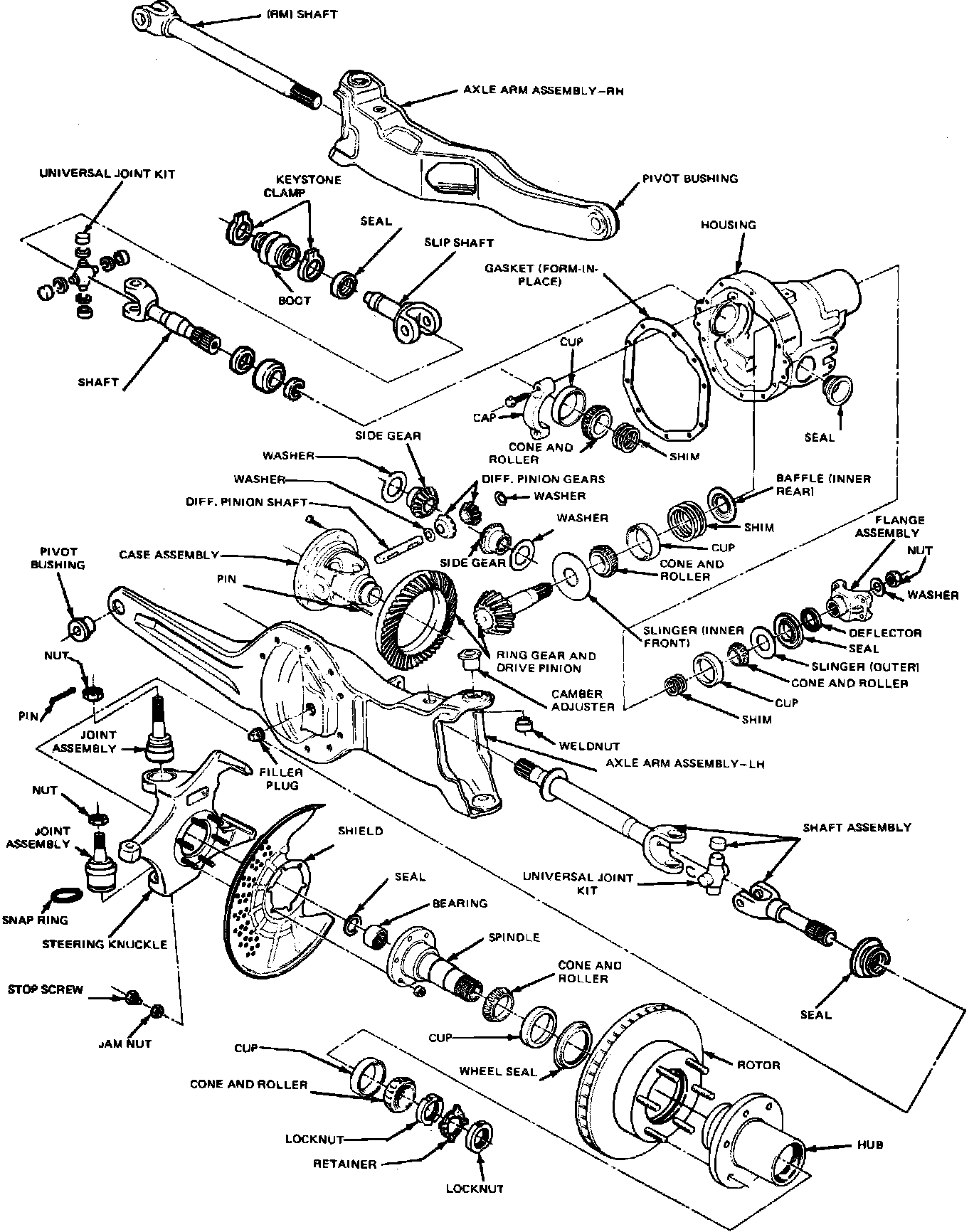 Fig. 1 Four wheel drive front axle assembly. 1980---87 F-150 & Bronco (similar to other 1980---87 models exc. 1986---87 F-350 w/Dana 60 Monobeam axle):