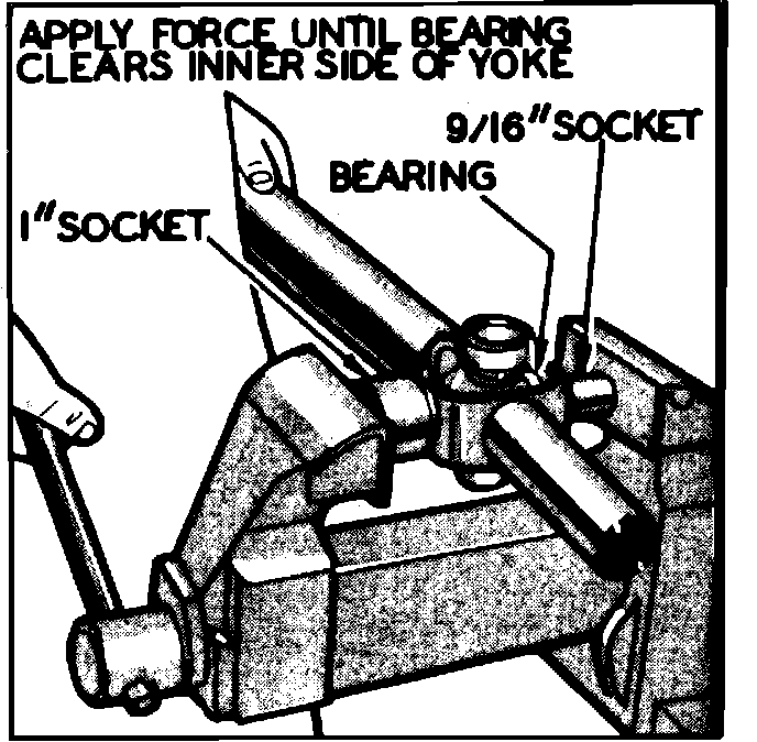 6. To remove opposite bearing from yoke, replace in vise with pusher socket on exposed cross journal with receiver socket over bearing cup. Then tighten vise jaws to press bearing back through yoke into receiving socket.
