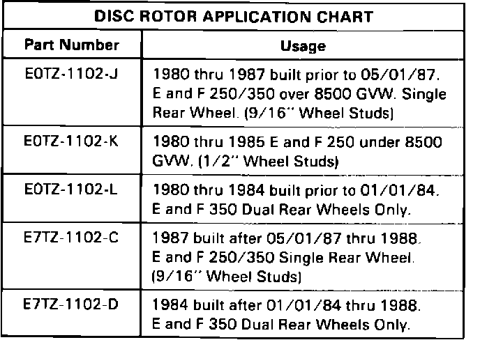 ISSUE: Shudder and vibration during brake application may be caused by cracks in the braking surface of the front disc brake rotors. Units that may be affected are 1980-87 E-250/350 and 4 x 2 F-250/350 vehicles with single rear wheels (SRW) and 1980-87 E-350 and 4 x 2 F-350 vehicles with dual rear wheels (DRW).