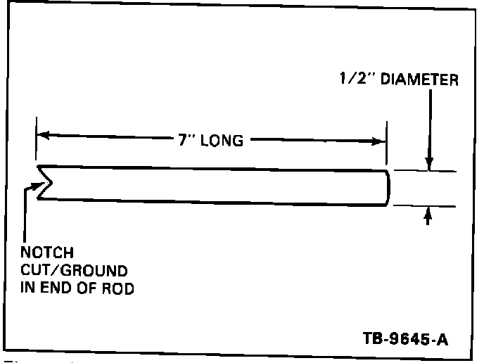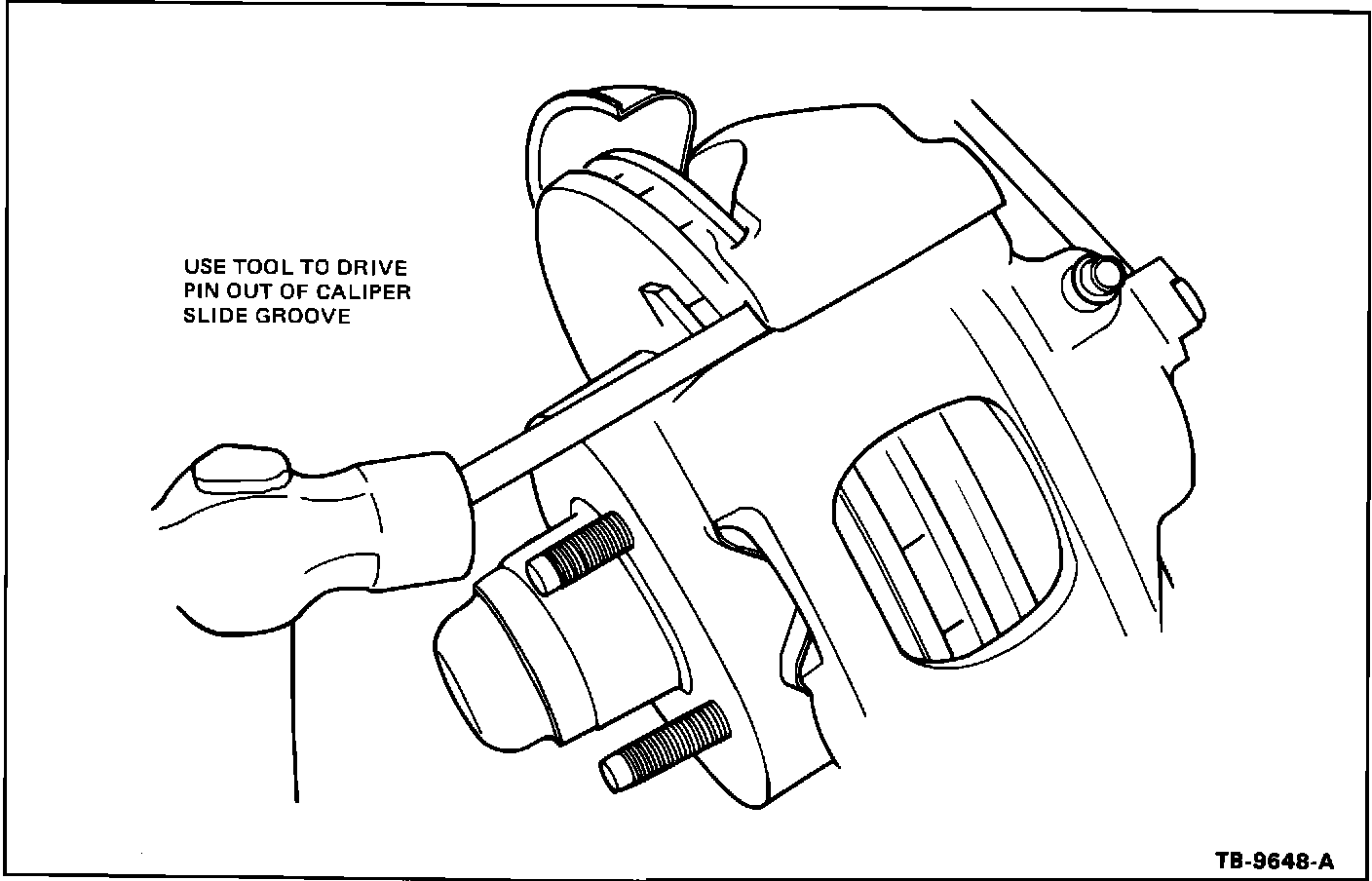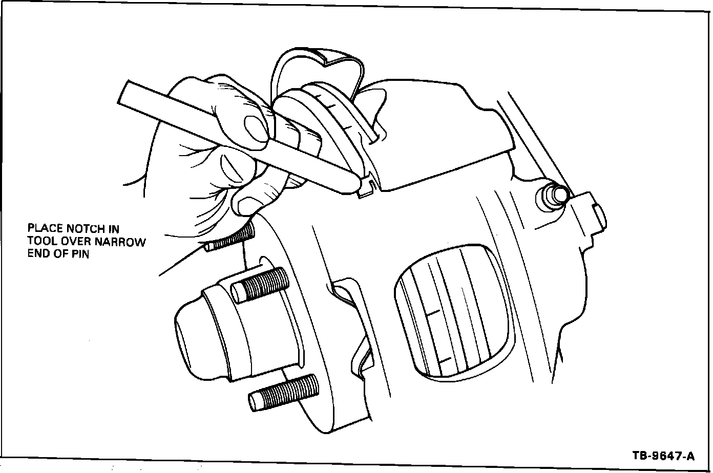 The caliper pin removal tool is recommended for use on all the above listed vehicles, including 1988 Super Duty, Figures 8 through 11. This caliper pin tool can be made from a 1/2 inch diameter rod 7 inches long. Simply grind or cut a "V" notch in one (1) end. The "V" notch is used to compress the pin retention tabs while the tool is also used to drive the pin out of the caliper slide groove. This tool replaces a pair of pliers and screwdriver as outlined in the Shop Manual service procedure.