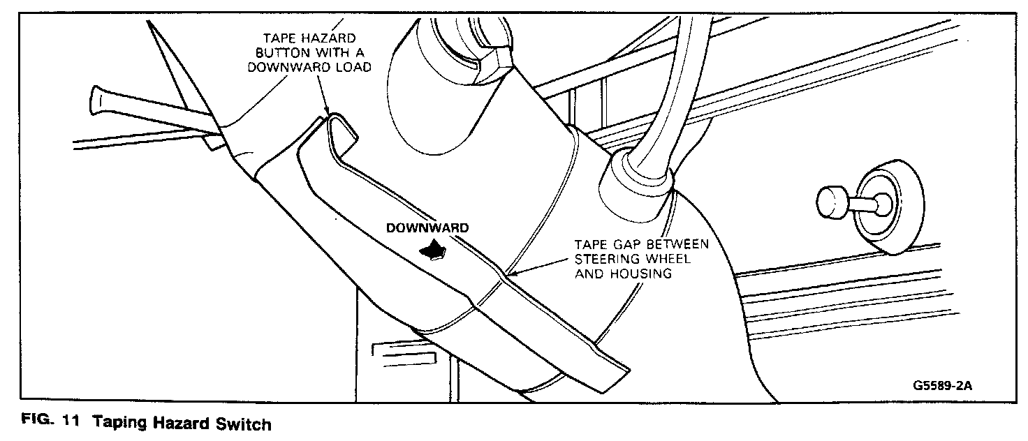 2. Tape the gap between the steering wheel hub and the cover casting. Cover the entire circumference of the casting. Also cover the adjacent seat and floor area with a suitable covering to protect the surrounding interior upholstery. Pull out the hazard flasher switch and tape it down toward the floor to provide clearance for drilling out the lock cylinder retainer pin.