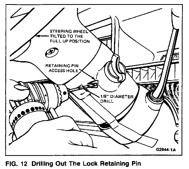 4. Tilt the steering column to the full up position and prepunch the lock cylinder retaining pin with a prick punch. Using a 3.17mm (1/8 inch) diameter drill with a right angle drive, drill out the retaining pin, going no deeper than 12.7mm (1 /2 inch).