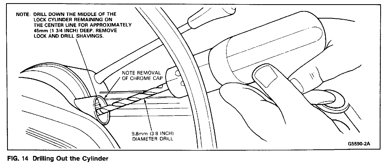 6. Using a 9.8mm (3/8 inch) diameter drill, drill down the middle of the ignition lock key slot approximately 45mm (1-3/4 inch) until the lock cylinder breaks loose from the steering column cover casting. Remove the lock cylinder, and the drill shavings from the base of the cover cast housing.