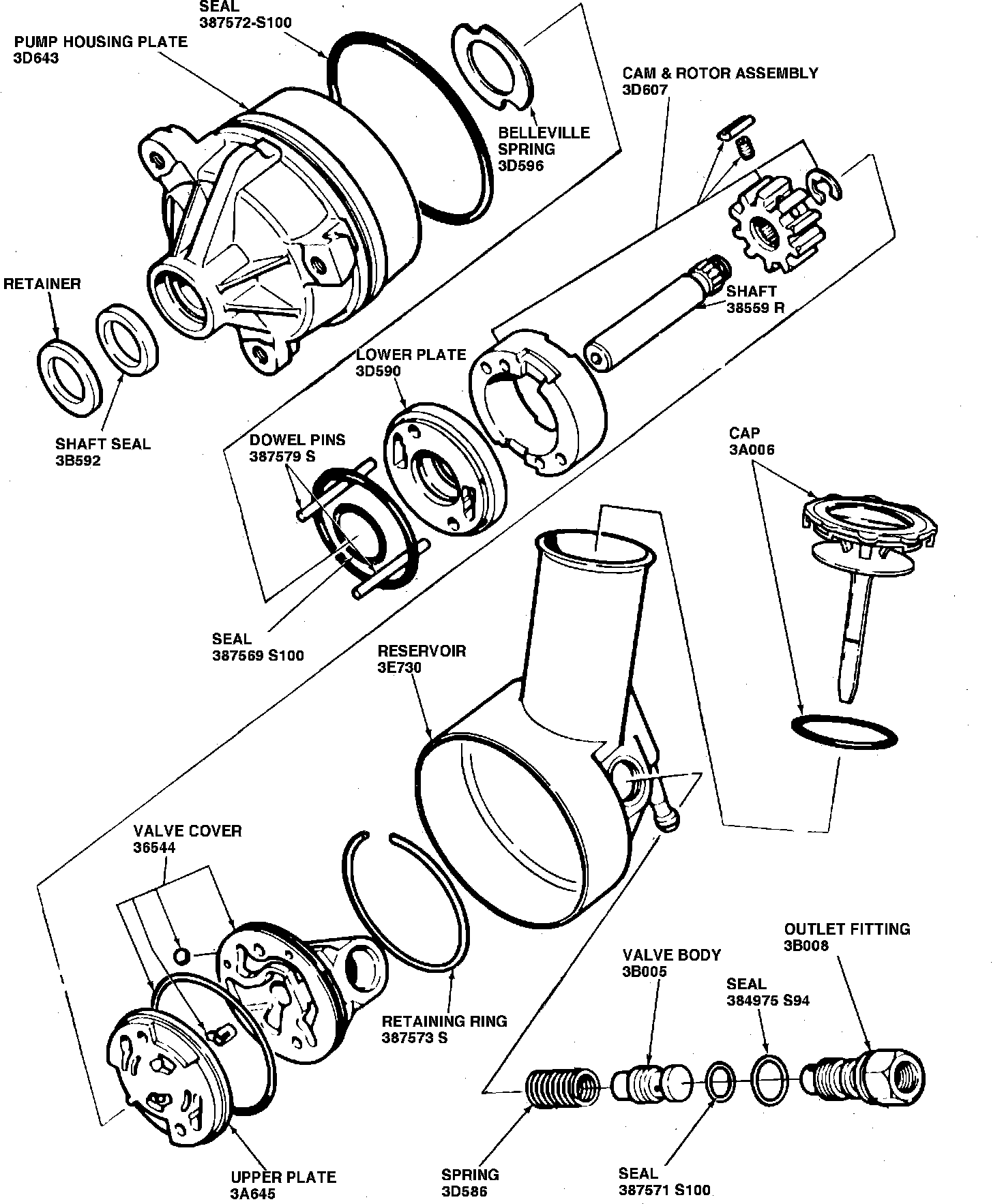 Fig. 1 Exploded view of Ford Model CII power steering pump:
