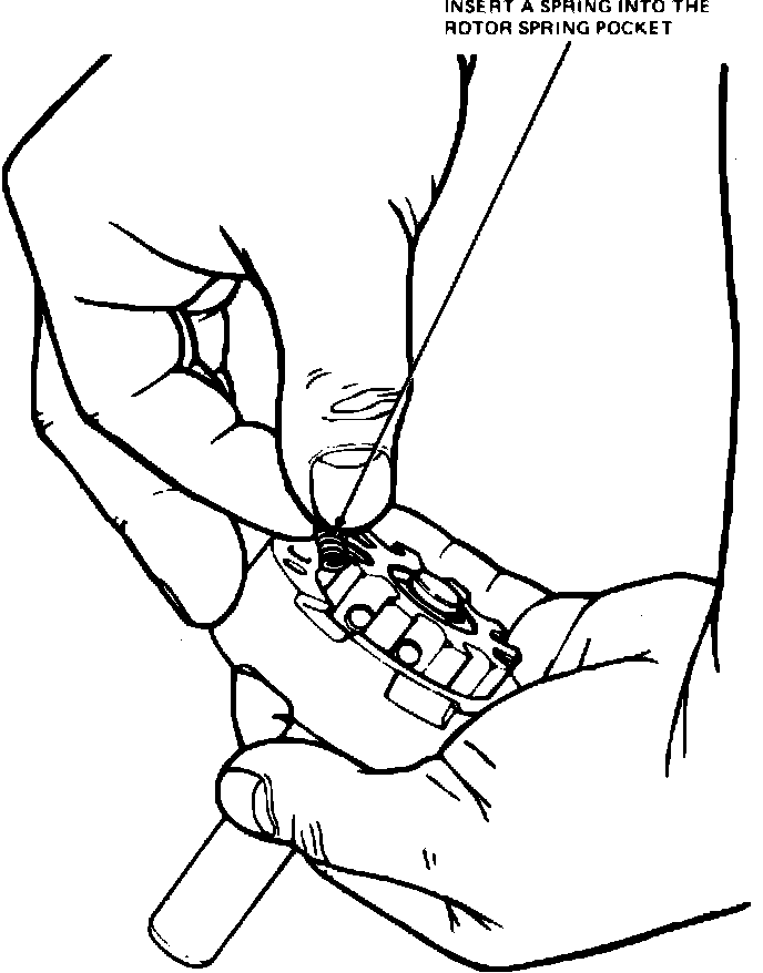 7. While holding cam stationary, index rotor left or right one space and install another spring and slipper until all ten rotor cavities have been filled. Ensure rotor springs and slippers remain in position while turning.