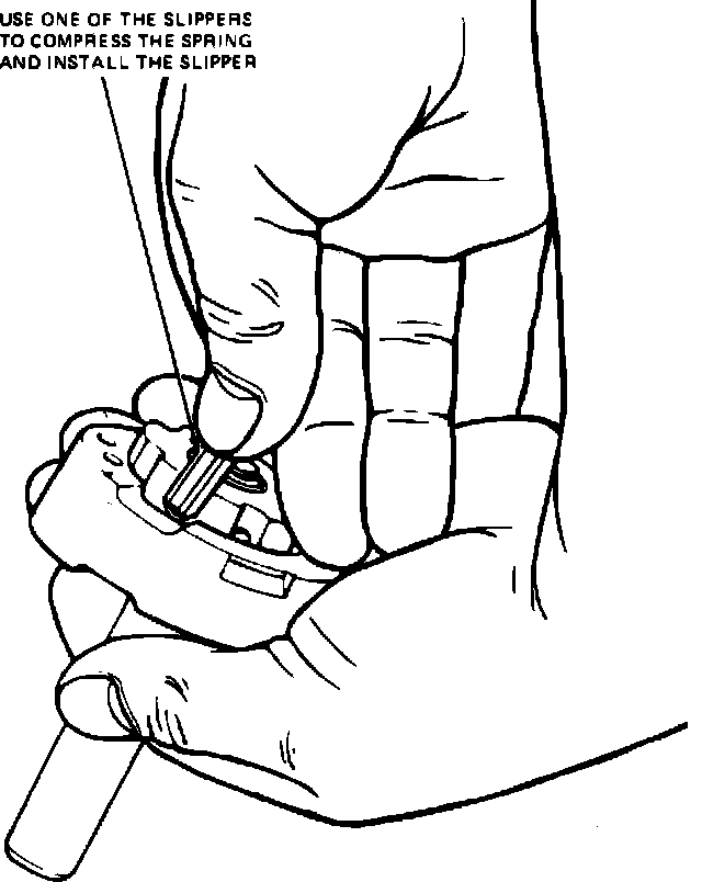 5. Use a slipper to compress spring, then install slipper with groove facing cam, Fig. 5.