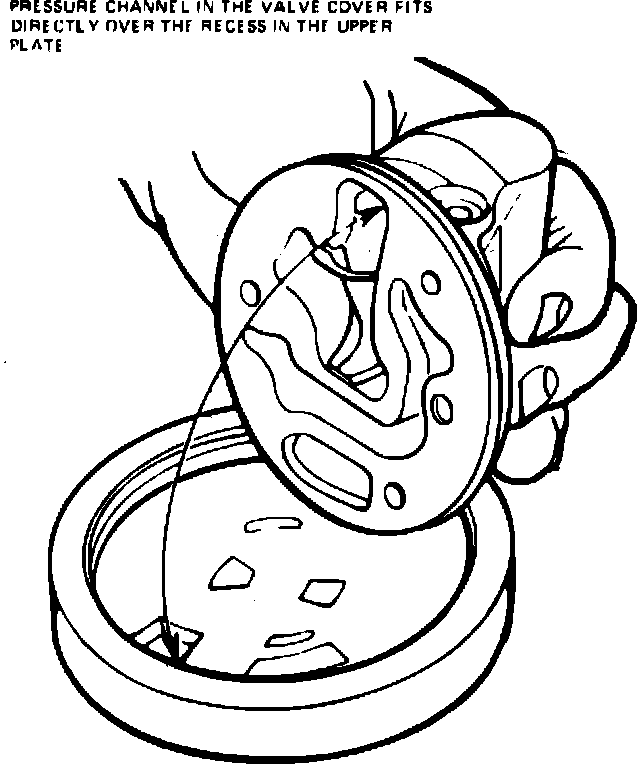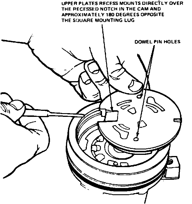 14. Position upper pressure plate over dowel pins with recess directly over recessed notch on cam insert and approximately 180 degrees opposite square mounting lug, Fig. 7.