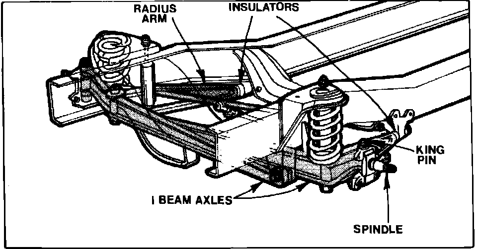 As illustrated in Fig. 1 there are two I-beam axles, one for each front wheel. One end of each axle is attached to the spindle and a radius arm and the other end is attached to a frame bracket on the opposite side of the vehicle.