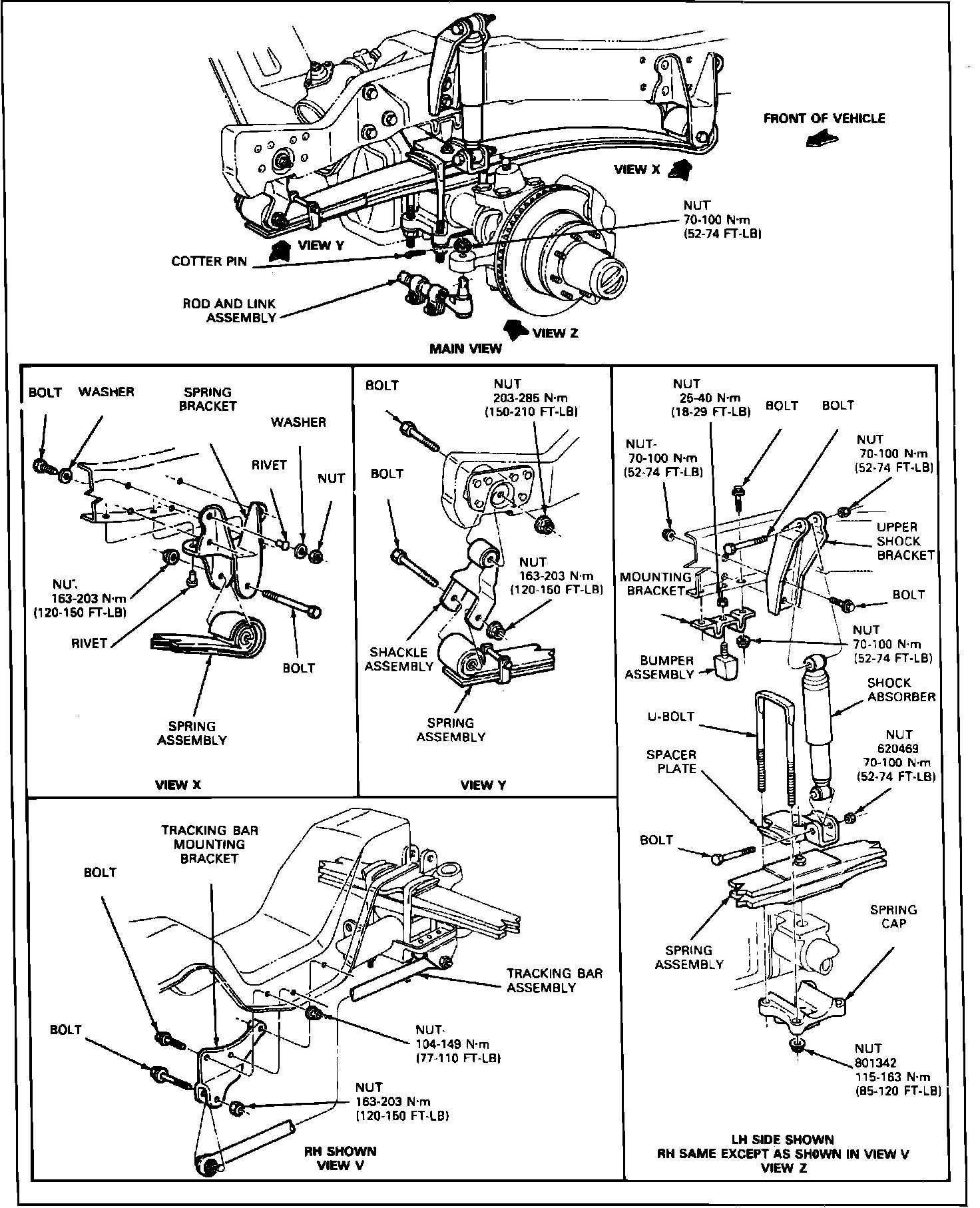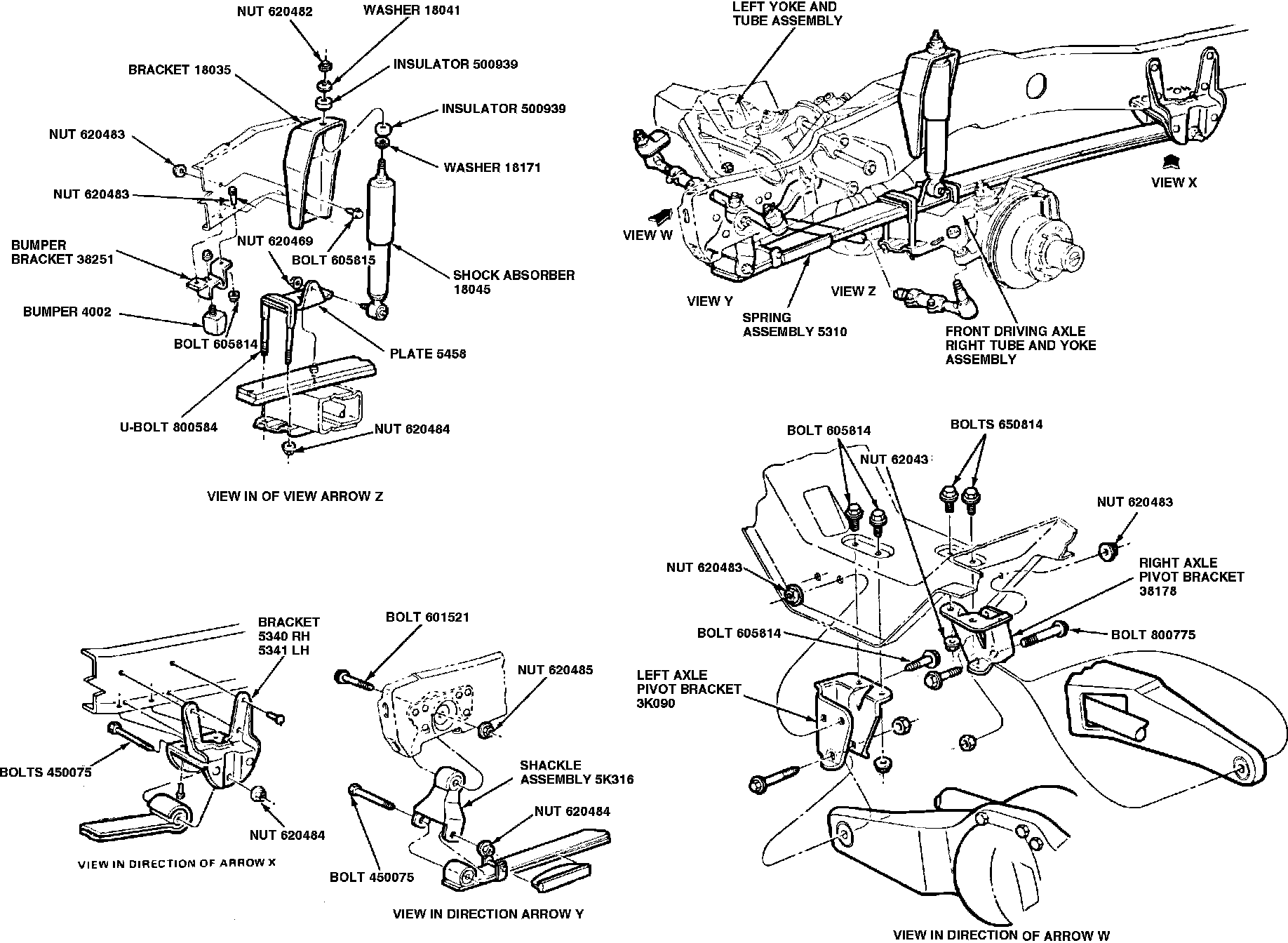 The front suspension used on these models has a one piece driving axle attached to the frame with two semi-elliptic leaf springs, Fig. 5.Each spring is clamped to the axle assembly with two U-bolts. The rear eye of the spring is attached to the hanger bracket. The front of the spring is attached to a shackle bracket. On the right spring cap, a tracking bar is attached with the opposite end mounted on the crossmember.