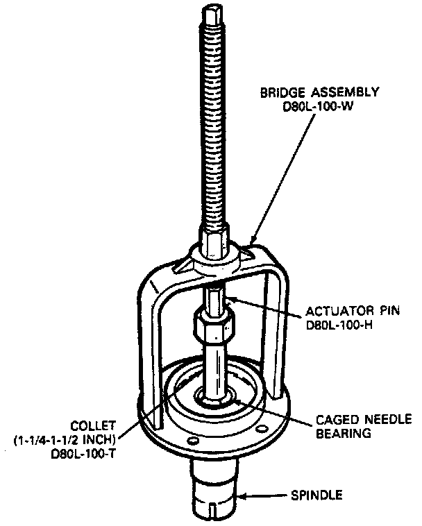 4. If required, remove the caged needle bearing from the spindle. Remove the seal. Pull the bearing out of the spindle using Collet (1-1/2 to 1-3/4 inch), D80L-100-T, Actuator Pin, D80L-100-H and Bridge Assembly, D80L-100-W or equivalents.