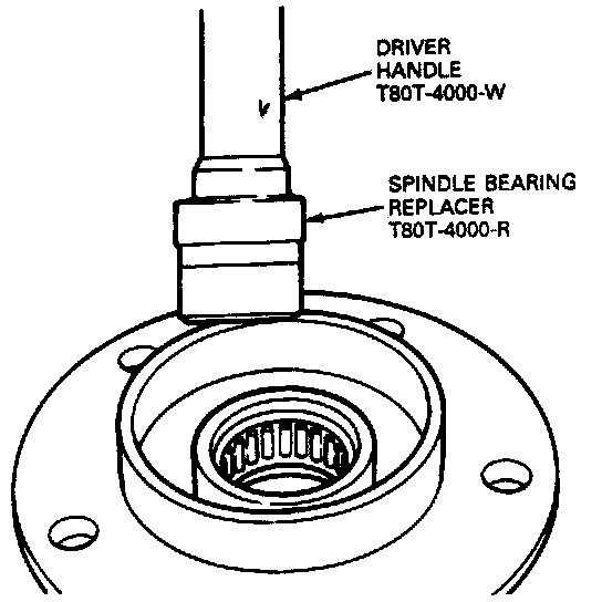 1. If removed, position a new caged needle bearing in the spindle bore. The writing on the bearing must face the rear of the spindle, toward the driving tool. Drive the bearing in the spindle with Spindle Bearing Replacer, T80T-4000-R and Driver Handle, T80T-4000-W or their equivalents. Pack the bearing with High Temperature (4x4) Front Axle and Wheel Bearing Grease, E8TZ- 19590-A (ESA-M1C198-A) or equivalent. Install the seal in the bore against the bearing.