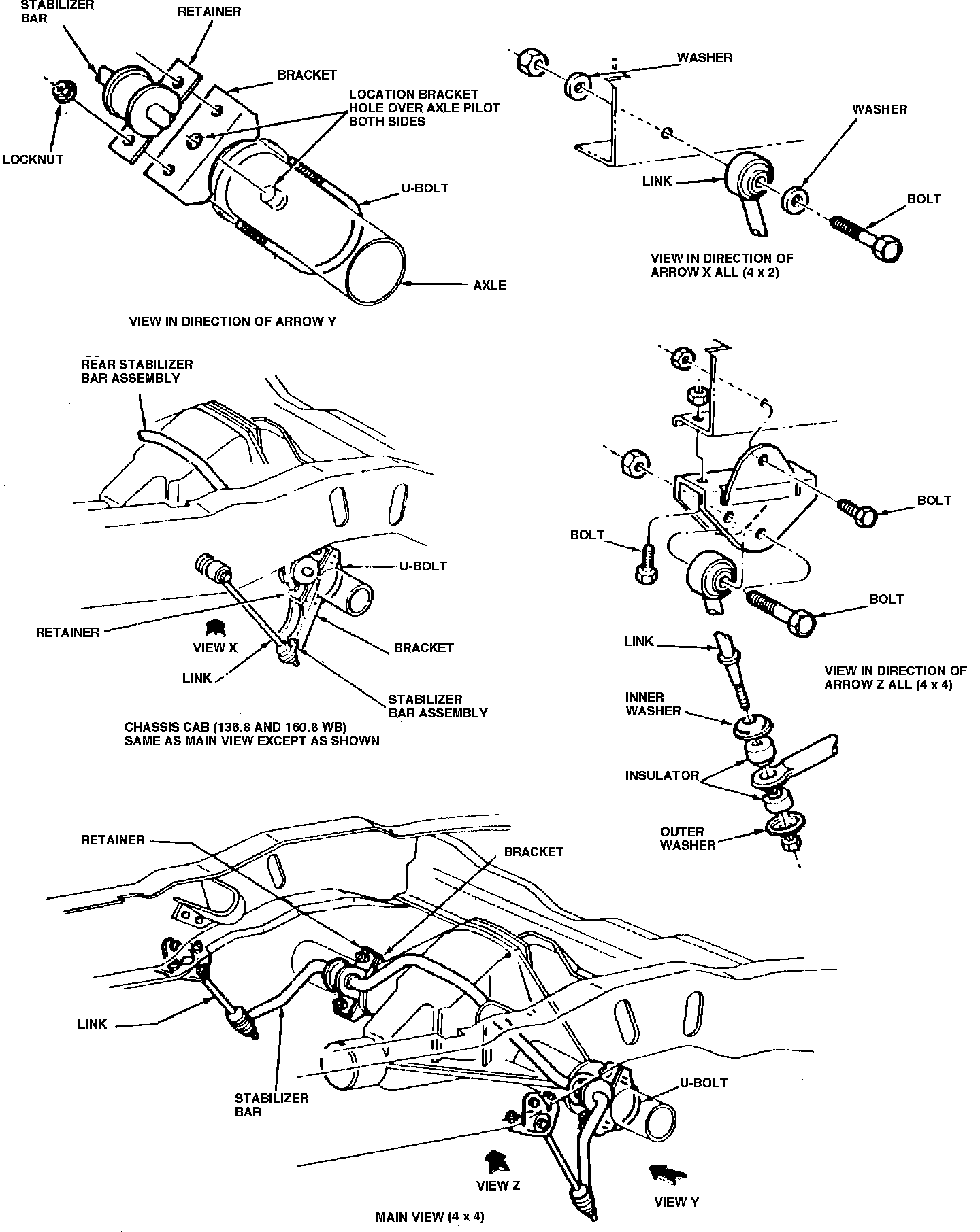 5. Remove U-bolt, bracket and retainer attaching nuts, then the stabilizer bar from vehicle.