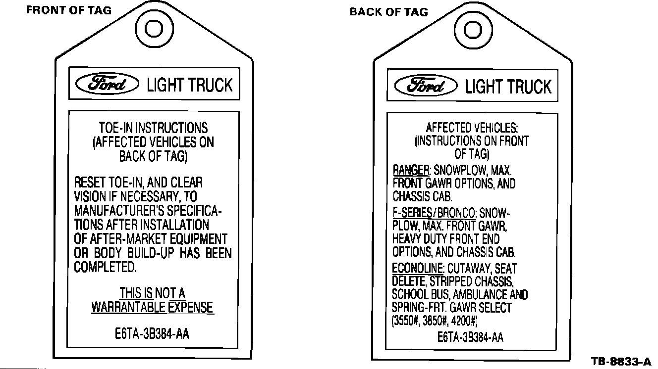 Certain model vehicles have a significant weight change on the front axle between manufacture by Ford and placement into service. This occurs when incomplete vehicles are completed by a body company or when equipment is added to a complete vehicle (i.e., winches, plows, tool boxes, etc.). This weight change can affect toe setting so these vehicles require that toe be reset.